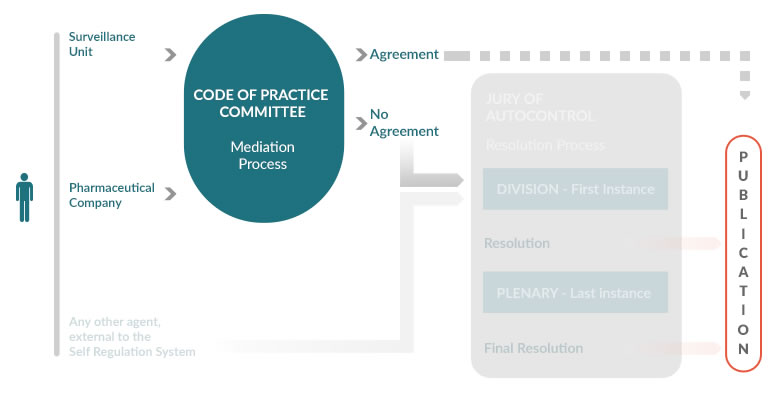 See below a graphic representation, within the complaint procedure, of the mediation stage carried out before the representatives of the Code of Practice Committee. It is only applicable to the complaints issued by the Surveillance Unit or a pharmaceutical company.